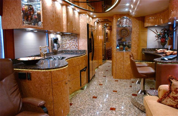 This bus has granite floors, retractable computer, gold fixtures and leather chairs.